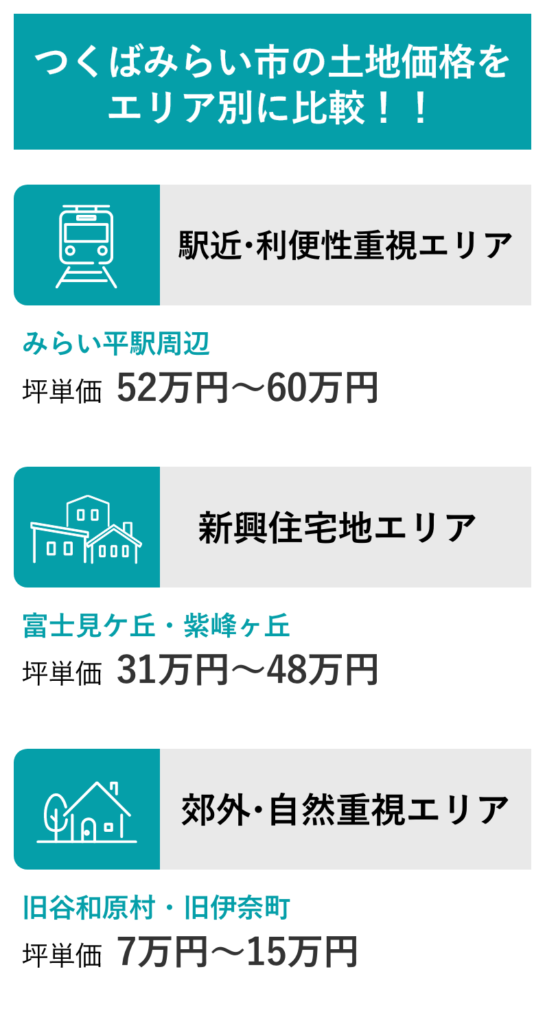 つくばみらい市の平均地価は坪単価で約17〜18万円と守谷市・つくば市に比べて割安ですが、みらい平駅周辺は50万円を超える地点もあり、局所的に高騰しています。今後も交通利便性や住宅需要の高まりに伴い、地価は緩やかな上昇傾向が続くと予想されます。
