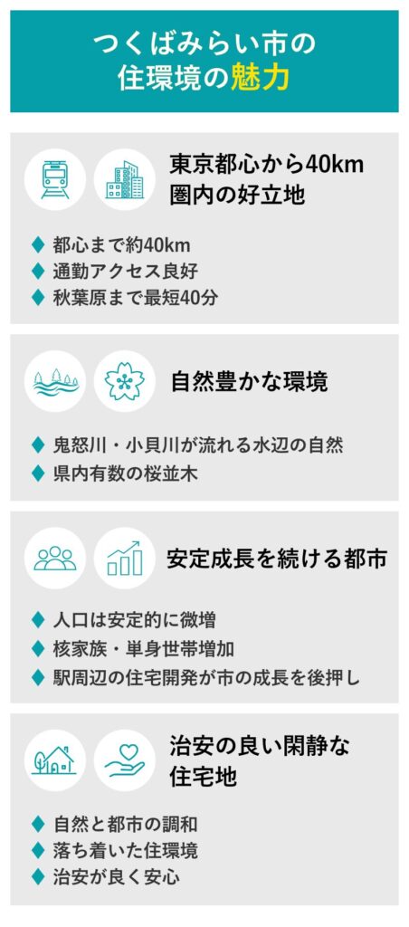 ・特徴:つくばエクスプレス「みらい平駅」徒歩圏のため、都心アクセスが良好。商業施設や教育施設も集まり、人気が高い。資産価値の安定性が見込めるエリア。