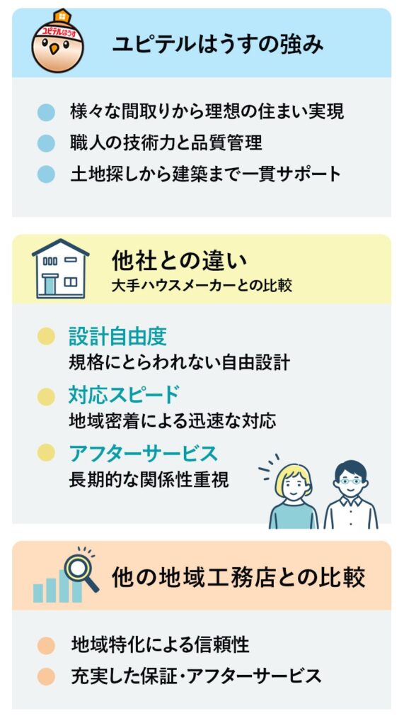 ローコストからハイグレードまで、施工会社によって強みや価格帯はさまざまです。ハウスメーカーだけでなく、地域事情に詳しい地元工務店も選択肢に入れることで、自分たちの希望や予算に合った最適なパートナーを見つけやすくなります。